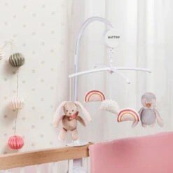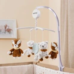 Cet adorable mobile muscial avec des petites peluches tournantes et dansant sur la mélodie de la berceuse garantit un sommeil apaisant et de beaux rêves. Le mobile peut être attaché avec sécurité au lit de ton enfant ou à son parc de jeu. Ces petites figures peuvent être facilement détachées et les attaches peuvent être facilement nettoyés.