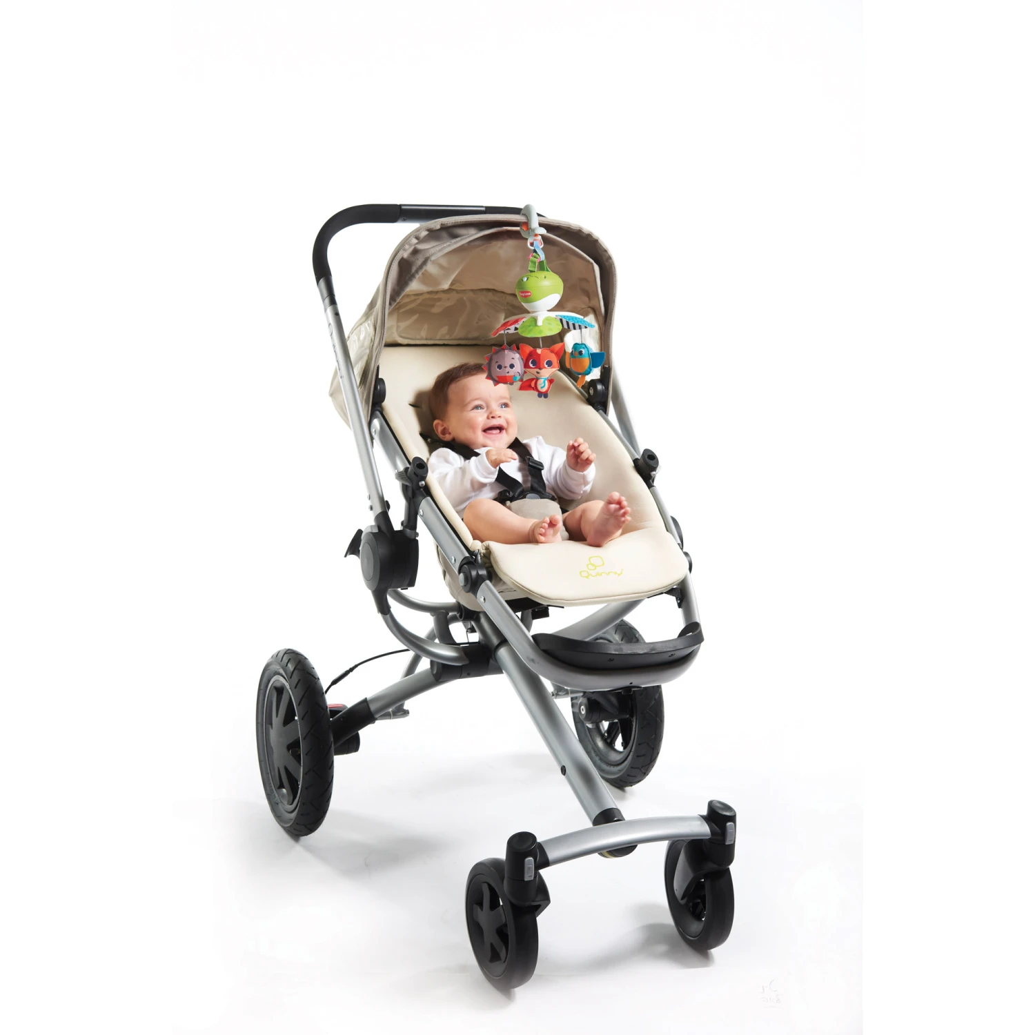 - Fixez le mobile Take-Along à la poussette, au parc, au lit pliant ou au siège auto pour ne jamais s’ennuyer.