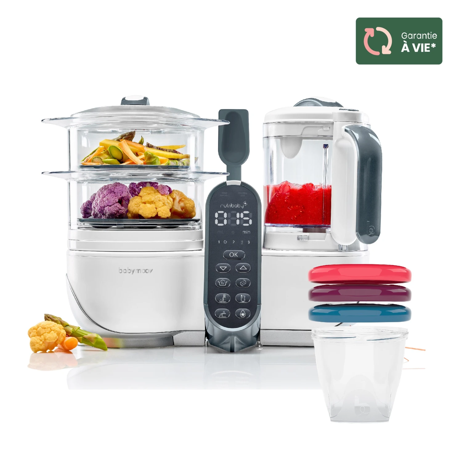 Le robot multifonctions Nutribaby(+) et les Babybols 250ml vous accompagnent pendant toutes les étapes du développement de votre enfant, du biberon à la diversification et plus encore. Côté préparation, le Nutribaby(+) est doté de 6 programmes automatiques, avec 1 bouton = 1 fonction : cuisson à la vapeur, mixage, décongélation, chauffe des petits pots, stérilisation et chauffe-biberons. Ce robot culinaire est également équipé d’une console centrale tactile et d’un minuteur intégré (alarme sonore et visuelle, arrêt automatique), pour une maîtrise parfaite. Ses 2 paniers séparés assurent une cuisson vapeur parfaite des aliments, le juste temps, en préservant saveurs et vitamines. Ses 3 vitesses de mixage associées au récupérateur de jus de cuisson vous permettent d’ajuster la texture souhaitée, selon l’âge de votre bébé. Avec sa capacité de 2200 ml (1500 ml pour la cuisson et 700 ml pour le mixage), vous préparez en un seul cycle les repas de votre bébé pour plusieurs jours !