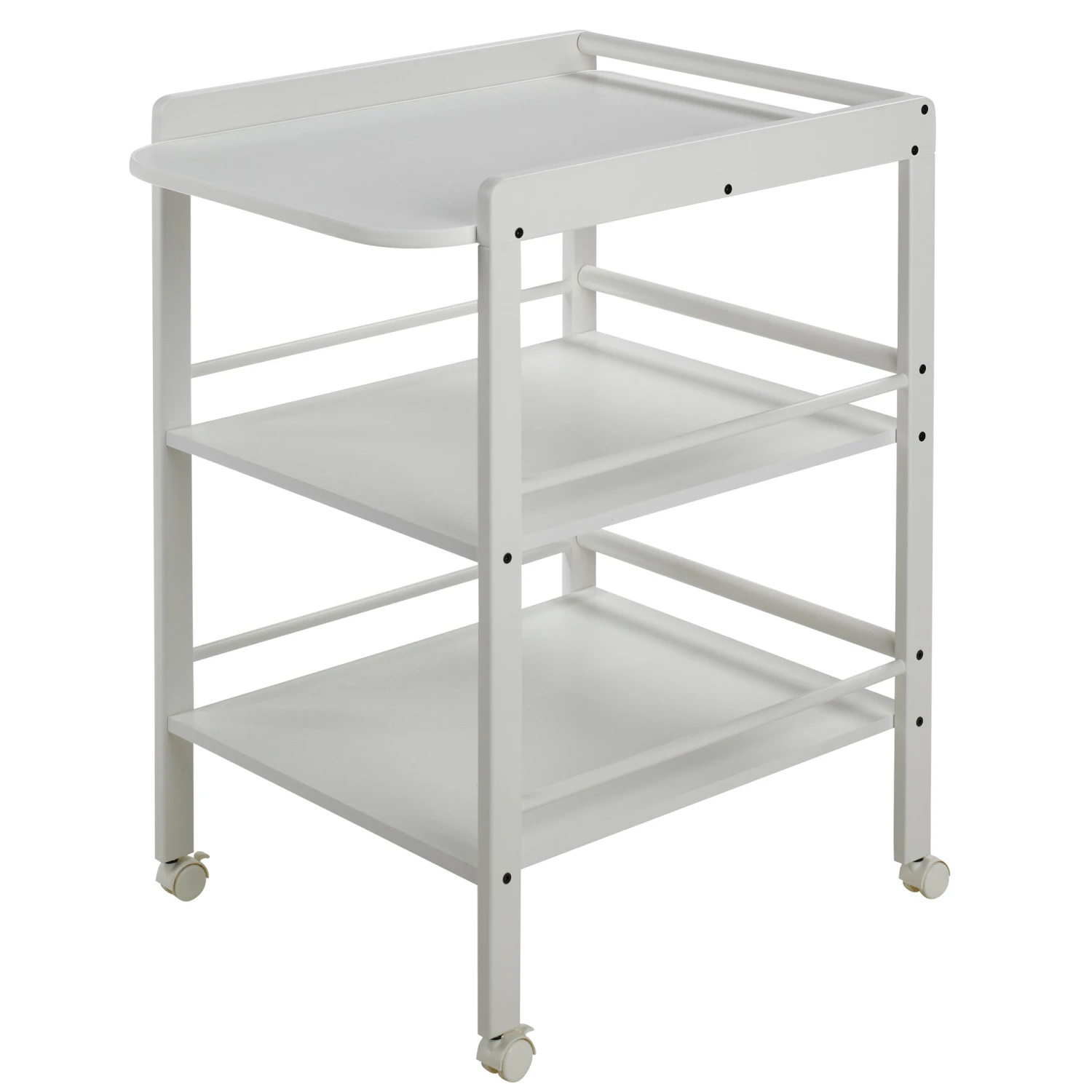 - 2 étagères de rangement offrent beaucoup de place à des produits de soins, des couches, …